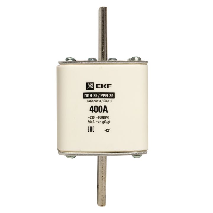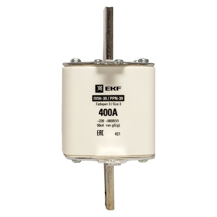 Плавкая вставка ППН-39 630/400А габарит 3 EKF. Предохранители плавкие ППН EKF, укомплектованные плавкими вставками типа gG/gL, предназначаются для защиты кабельных линий и промышленных электроустановок от токов перегрузки и короткого замыкания. Предохранители применяются в электрических сетях переменного тока частотой 50 Гц с напряжением до 660В. Применяются для крепления в распределительных и вводно-распределительных устройствах. Предохранители плавкие ППН могут устанавливаться в основание с держателем, а также в специально предназначенные рубильники. В комплект поставки предохранителей плавких ППН основание с держателем не входит и приобретается отдельно.Документация fus-39/630/400
